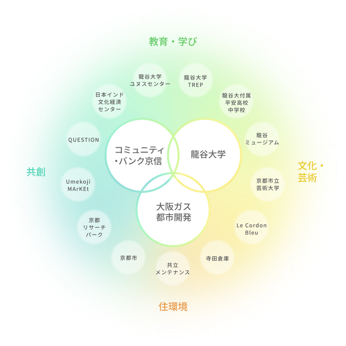 コミュニティ・バンク京信、龍谷大学、大阪ガス都市開発で構成する共創HUB京都コンソーシアムは、社会課題解決につながる新しい事業の支援やコミュニティ形成、人材育成を推進しています。