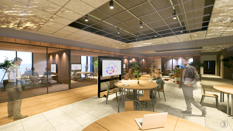 ③シェアオフィス・プロジェクトスペースイメージ、④ピロティ広場、の完成予想図です。