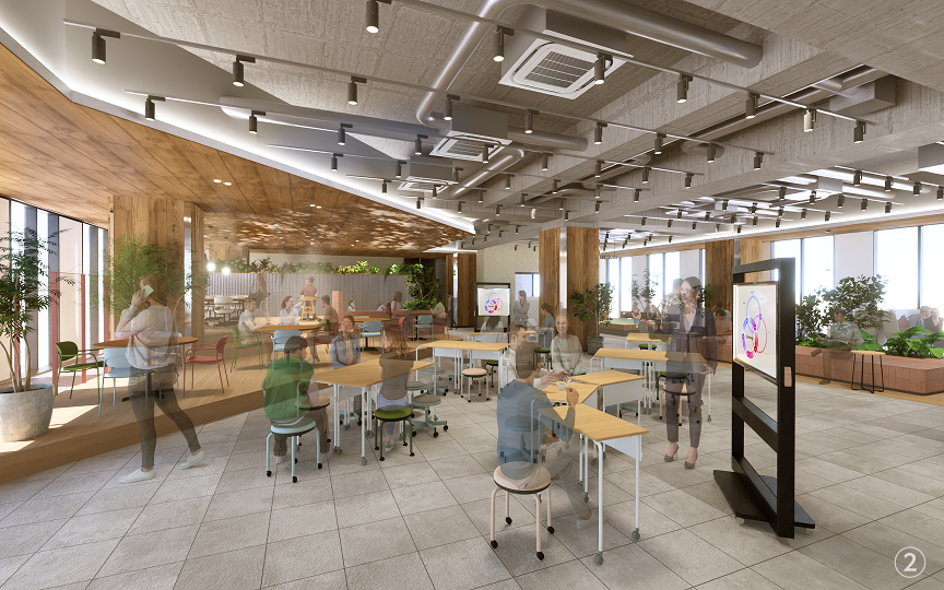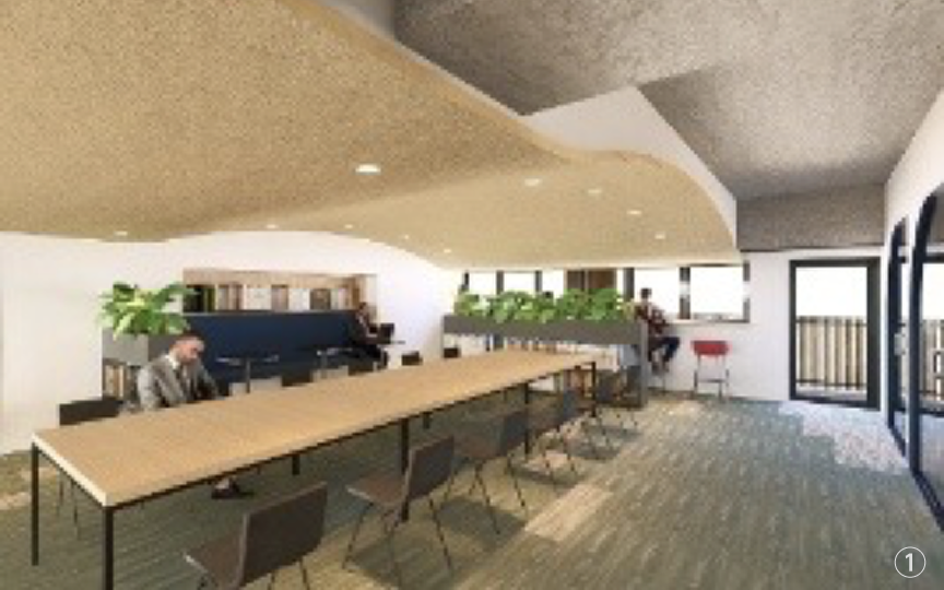 ※パースは①交流型賃貸マンションワークラウンジ、②コモンスペース、
